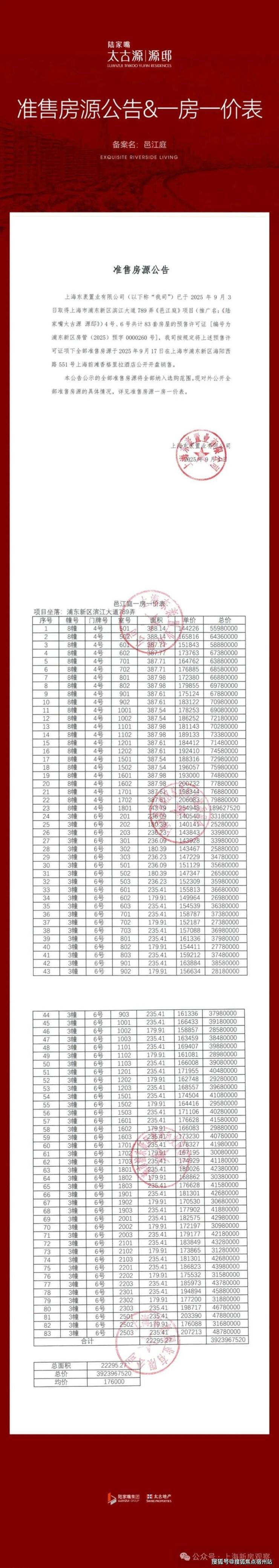 最新消息!太古地产大陆首个住宅【陆家嘴太古源•源邸】前面几批已基本售罄!第四批次加推1,5两栋楼,加推60套约240-388㎡江景大平层;12月20日已过会均价18万/㎡!还有实景180/240㎡/388㎡实景样板房开放,售楼处线上火热预约中!