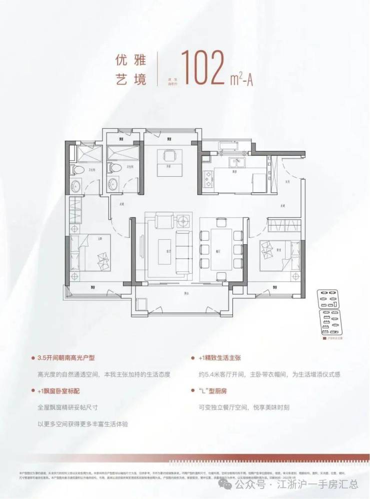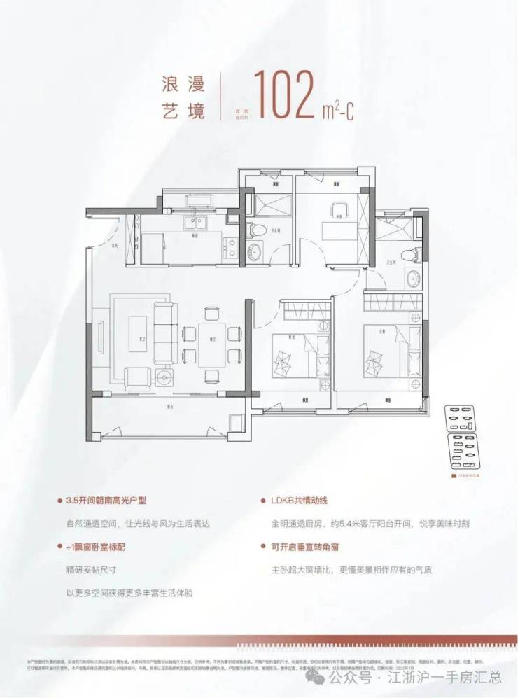 102㎡三房两厅两卫的舒适户型,约5.4m横厅设计,3.5开间朝南,得房率约80%左右(*该得房率仅供参考,最终以开发商官方数据为准);每间房均有飘窗,全屋飘窗共享有额外的面积约13㎡(*此处面积仅供参考,最终以开发商官方数据为准)在市场上也是少有的产品。