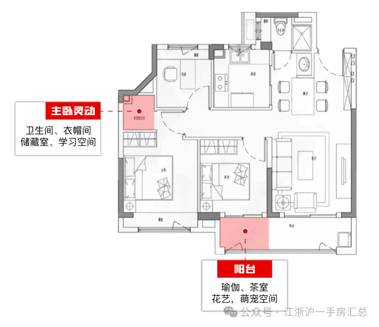 89㎡3房2厅2卫户型,一般只能做1卫,但项目在主卧设计了一个“+1灵动空间”,你可以像样板房把它打造成卫生间,项目预留了排水管。也可以做成衣帽间、梳妆台、储藏间,或者学习空间。