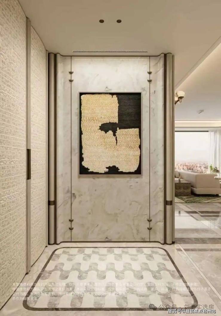 黄金贝壳的石材 、风声 水起曲线金属 + 背景墙岩板 + 金属墙布 、主卧标配约4.2米超大面宽 定制皮革背景墙 ...