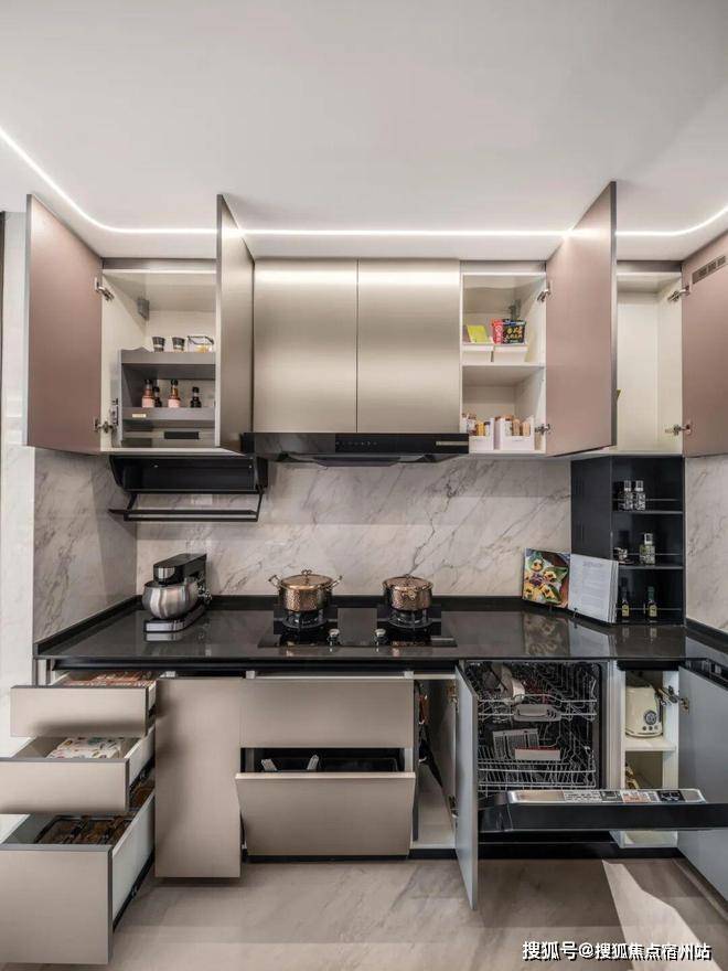 厨房的收纳空间几乎能填满整个厨房空间,这些收纳空间不是随意塞满的,而是根据日常烹饪习惯的频率来贴心规划。