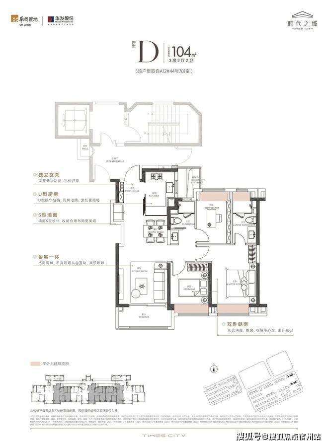 建面约104㎡3房2厅2卫,八批次总价约507-585万, 经典动静分离户型,三开间朝南,独立玄关,U型厨房,预留分户S墙设计,可释放厨房冰箱空间!从最新开放的104户型样板间可以看出,项目对新品户型的收纳储藏空间做了全维升级,实用性更强。时代之城售楼处电话:400-8894-638(最新房源推送)