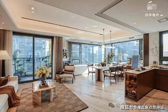 浅香槟金铝板点缀横向金属线条,四季隐秀售楼处电话☎ 400-8266-670✅✅搭配更多的玻璃窗面和玻璃栏板,在阳光下呈银灰光泽,夕阳映照下更加漂亮。