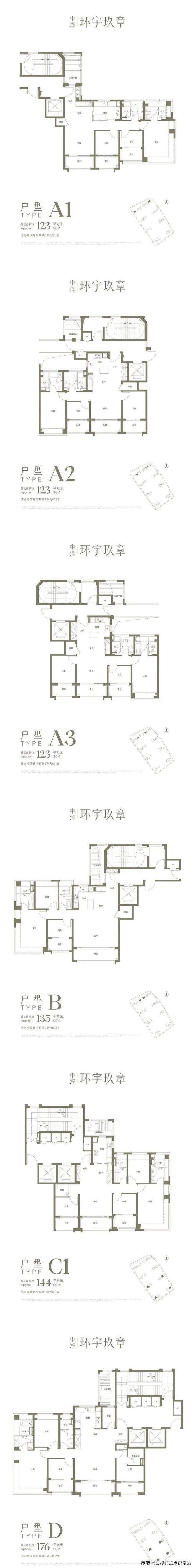 4、【新规后大三房】135平户型,三阳台,全飘窗,实得率约93%。每个卧室空间尺度舒适,这个户型非常适合需求强收纳的粉丝,收纳总量可达32.5平,实现收纳自由;