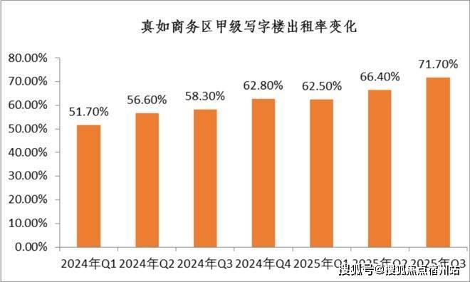 真如的产业规模十分扎实。公开数据显示,2024年,中海中心跃居上海写字楼年度租赁市场成交榜首。真如商务区甲级写字楼出租率也一路攀升——从2024年一季度的51.7%,提升至2025年三季度的71.7%。