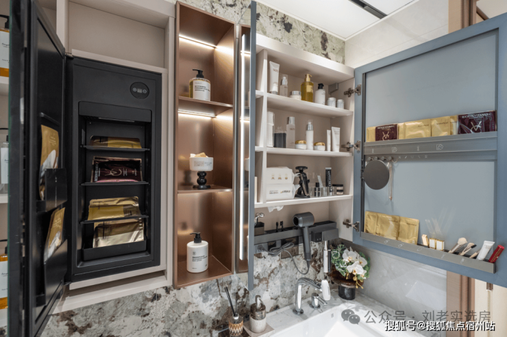 一站式梳妆收纳解决方案 ,通过镜柜内置分区、卫浴柜斜翻抽等设计,实现一站式完成全妆,解放卧室空间
