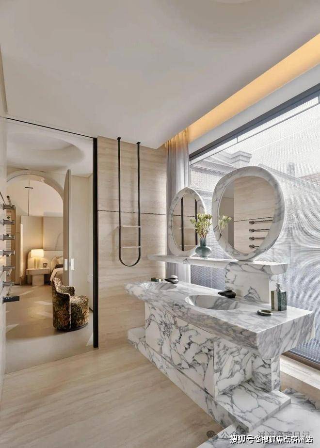 整体以米白色调为主,加入了少许鲜亮橘色,烘托休憩情绪。✅✅华润士林润园售楼处电话:400 - 8824 - 258✅✅主卫浴采用双台盆设计,方便双人同时使用,由天然洞石打造的卫浴空间更具有一种低奢隐逸的度假气息。