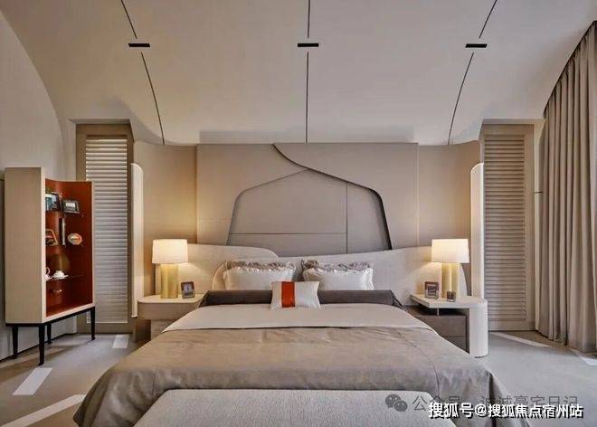 顶层专属于主卧,推开双开门,拱形天花设计尽显浪漫,挑高至3.8米,一条长灯带自浴室贯穿至整个卧房,分置于灯带两侧的弧形结构,✅✅华润士林润园售楼处电话:400 - 8824 - 258✅✅环抱出一份安心。而其床头背板也被设计成拥抱的视效,为空间增添温暖包裹的氛围。