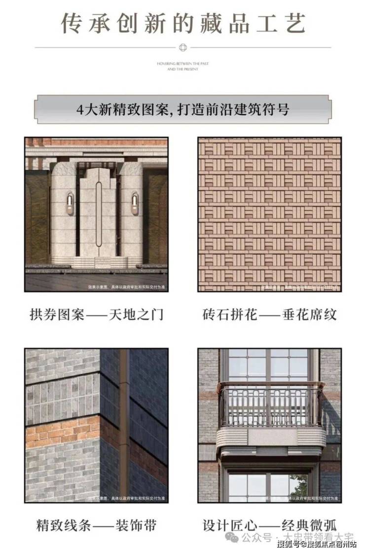 ①新精致图案在建筑风格上,项目运用了4大新精致图案,从拱券图案、砖石拼花再到引入了文艺复兴建筑经典手法——刻槽技术,打造建筑装饰带,运用石库门椭圆造型元素,打造前沿建筑符号!