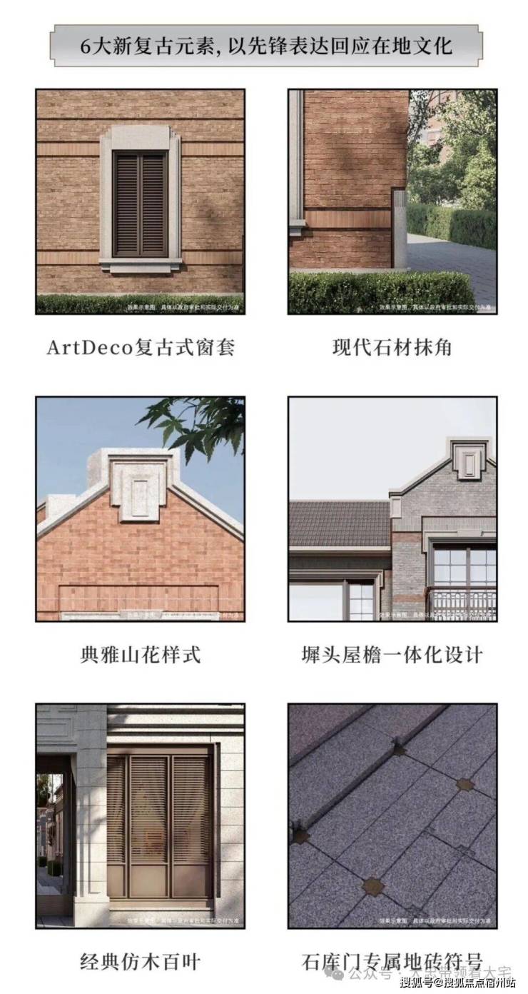 ②新复古元素深入看细节,你会发现项目高颜值的6大新复古元素。包括Artdeco复古式窗套、现代石材抹角、典雅山花样式、墀头屋檐一体化设计、经典仿木百叶、石库门专属地砖符号等,用先锋表达回应在地文化。