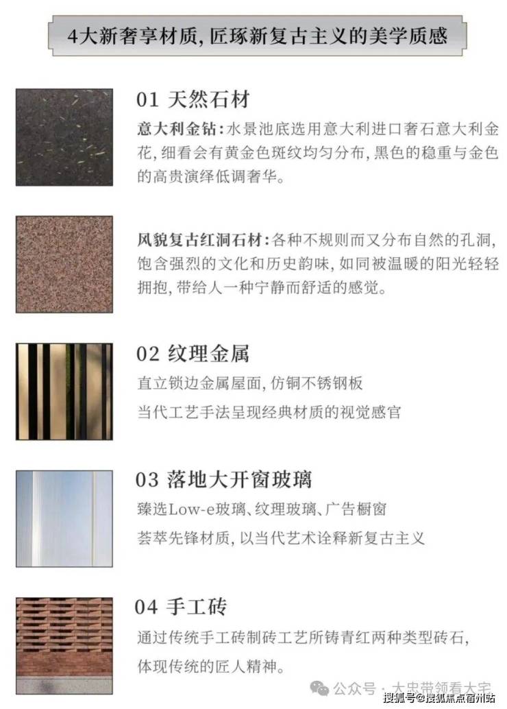 ③新奢享材质石材是海派建筑的标志,桐安里对于这种昂贵用材当然不会吝啬!项目采用天然石材和现代工艺相结合的手法,水景池底则选用意大利进口奢石金钻,大门选用风貌复古红洞石材。墙面采用传统手工砖,有青红两种类型。垂花席纹的拼砖,手工捶打的铜门等也彰显了项目的匠人本质!