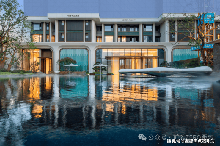 浮光池院水院会客厅,现已实景呈现,水景中央的艺术小品,如一滴水在湖面晕开,泛起阵阵涟漪。