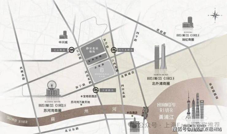 仅从图上看,该地块直线距 苏州河约1公里,直线距 外滩约1.4公里,直线距 北外滩约1.7公里,直线距 3/4号线宝山路站约300米,直线距 10号线四川北路站约560米,区位优势明显。
