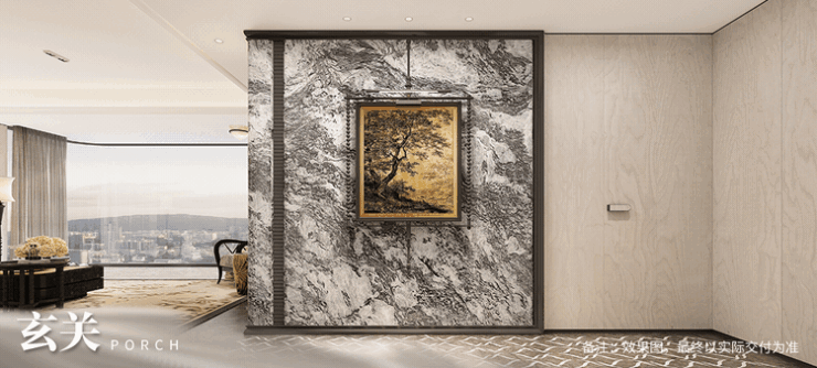 一进门的玄关地面,升级为宝珀灰+白慕斯石材拼花,仪式感拉满。