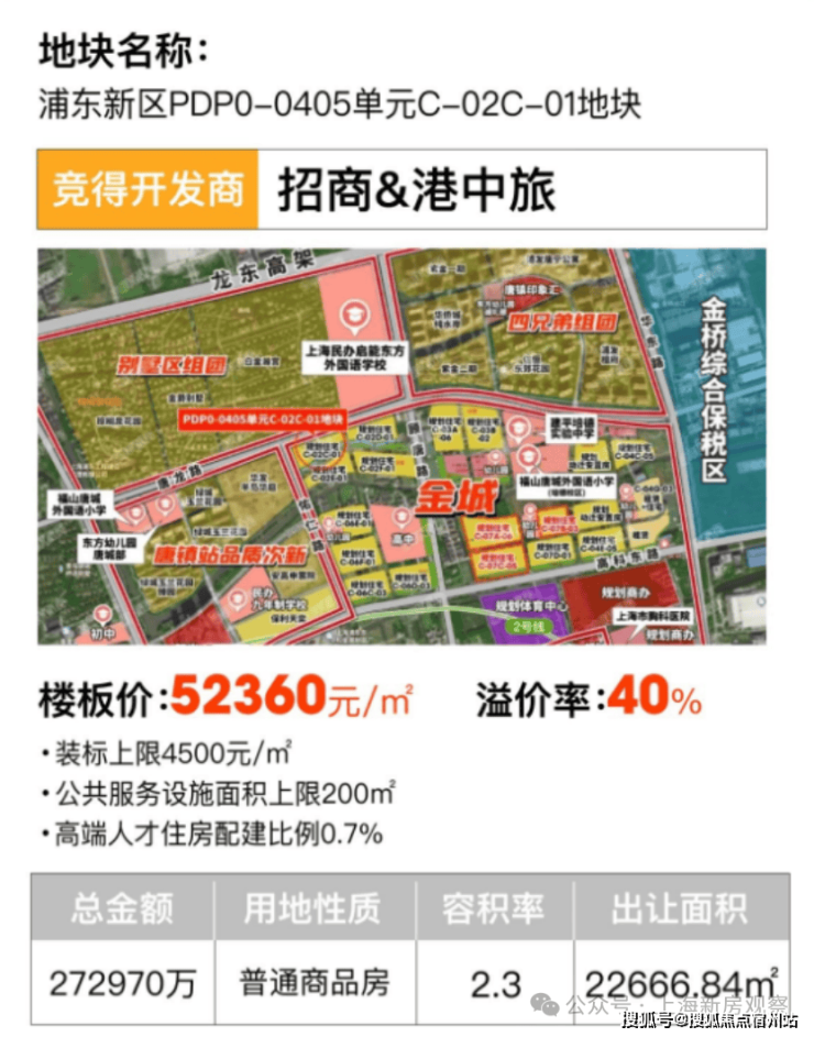 土拍重磅新闻——7月25日上海六批次土拍结束,唐镇地块再次赚足市场眼球!经过62轮 鏖战,最终由 招商&港中旅 以总价 27.3 亿,楼面价 5.24万 元/m²夺得!溢价率突破 40% !!!未来售价预计将突破 9万/m² ,已迎来价值爆发窗口期!