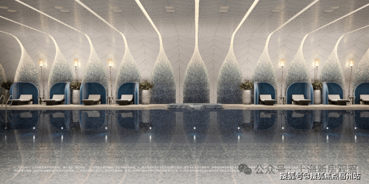 从示范区的打造上来看,保利打造了度假感氛围!采用了国际度假酒店的打造手法,从门头、 具有海蓝色的水景 、 海岛感的花园植物 , 丰富艺术品的植入 ,以及非常亮眼的 上海首个浮雕水景艺术卡座 ,营造轻松、惬意的氛围,像这样的松弛场景在项目中数不胜数,给到客户强烈的度假感和松弛感。
