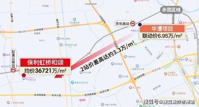 一方面,沿着示范区线2站外的华漕已6.95万/㎡,1站外的华新4.75万/㎡,这样的差价在全市都极为少有。