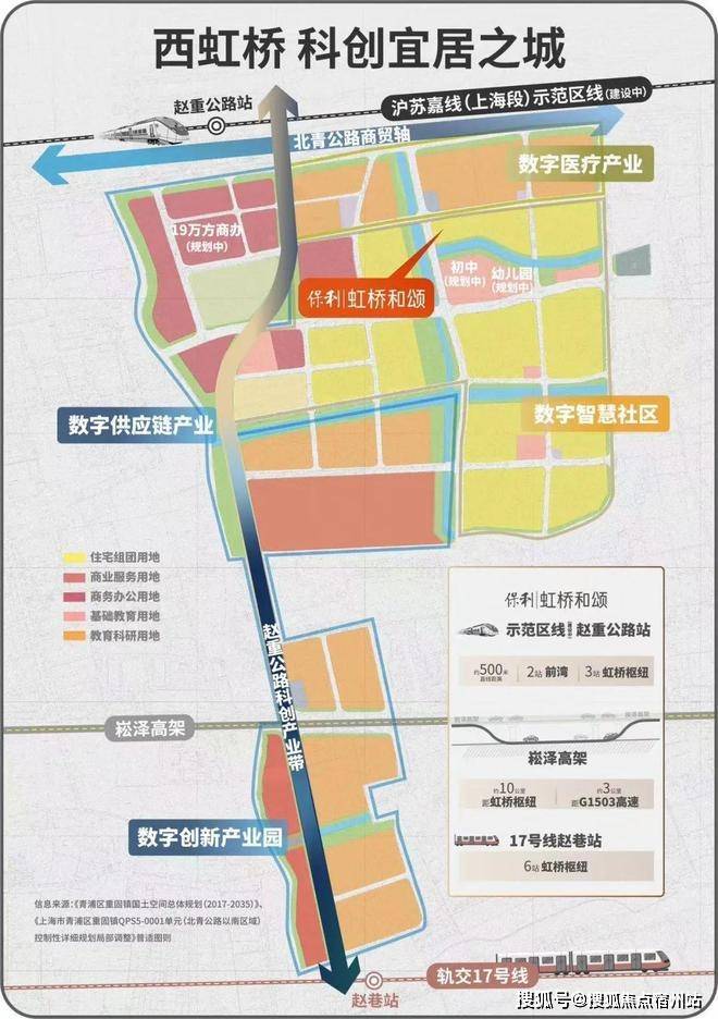 保利虹桥和颂位于青浦新城现代新型人文示范镇——无界百创城。重固南部虹桥无界百创城未来发展定位为科研板块,能级高、潜力大、圈层纯粹。目前无界百创城土地收储工作基本完成,土地出让有序推进,招商引资全面启动,未来将成为大虹桥区域新的“创新数字港”。构建“一核两翼”功能空间布局。紧扣“1 2 1”产业体系,引领未来特色产业高地。产城融合的“创新数字港”,正在布局“数字赋能”跨界技术融合应用场景,构建新能源、智能网联汽车配套集群,更是引进了申通、德邦、固买等优势企业入住。