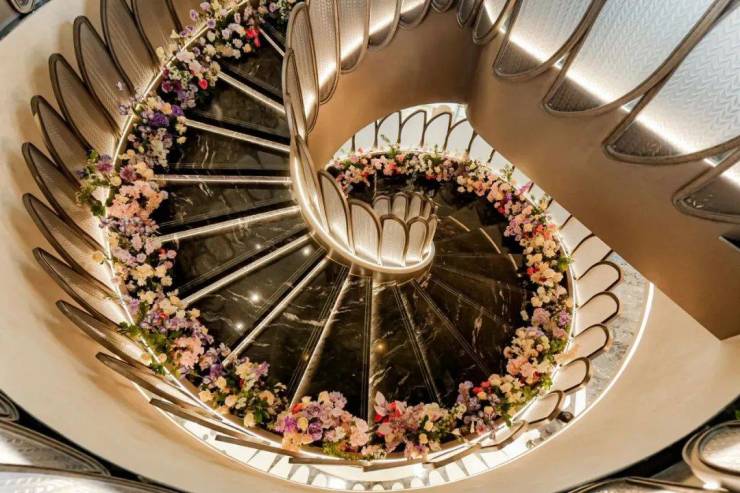 进门之后,恍若走进一幅立体绽放的画卷。地面采用了石材拼花,纹理如行云流水般舒展,在光影交错间勾勒出 低调的奢华。