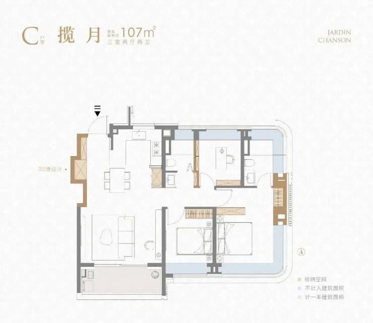 不到90㎡的建面实现3房一步到位,功能性上符合市场需求!同时利用科学的收纳和S墙设计保障了室内空间的井井有条,又通过大量飘窗和阳台等提升尺度感,尤其是厨房带飘窗你见过吗?②建面约107㎡3房2厅2卫户型: