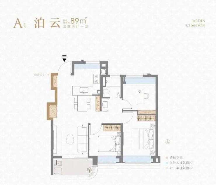 ①建面约89㎡3房2厅1卫户型: