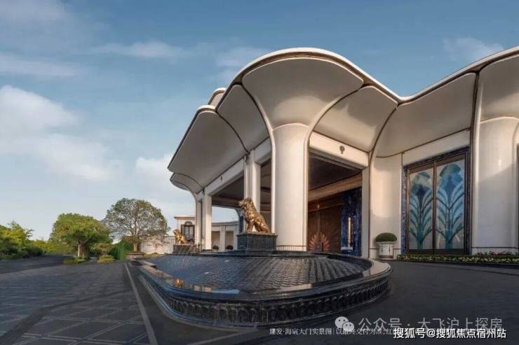 约65米环抱式落客前场,灵感源于“上海豫园-湖心亭九曲桥”,双尊威严铜狮静立、双株名贵金桂环抱一汪“尊华瑞鳞”水景,镇守家宅安宁,寓意流水生财。