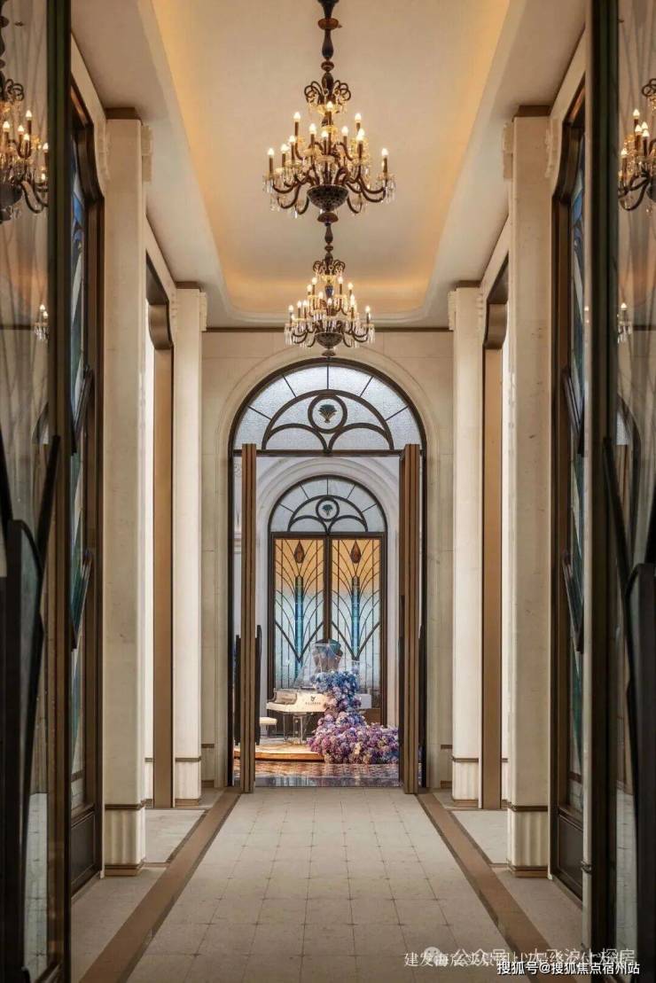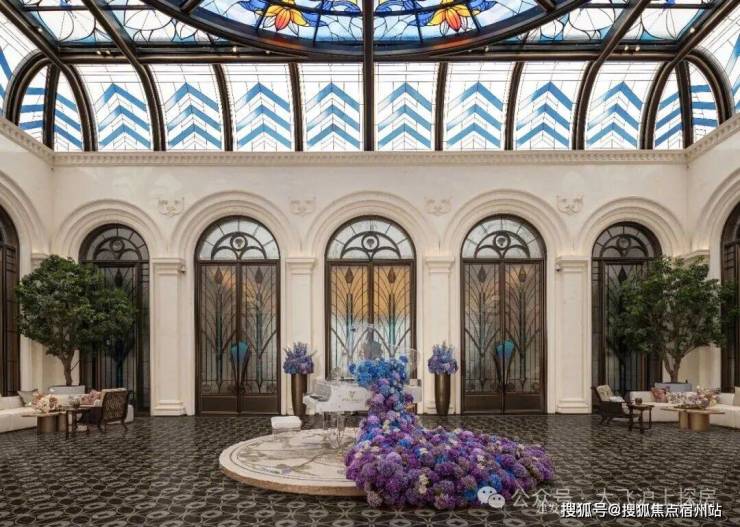 彩绘玻璃穹顶漫射柔和天光,艺术拱门与浮雕墙面交替排列,中央紫蓝渐变花艺装置描摹四季流转之美,可上演私享音乐会、业主演说会、亲子读书会、浪漫下午茶等,复现百年和平饭店的顶层社交场景。