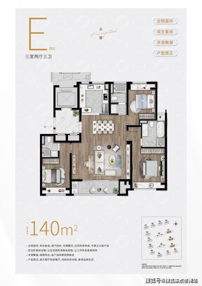 建面约140㎡3房3卫户型,✅✅陆家嘴锦绣云澜售楼处电话:400 - 882 - 4258✅✅三开间朝南+大横厅的设计,整个南向采光面相当宽绰。