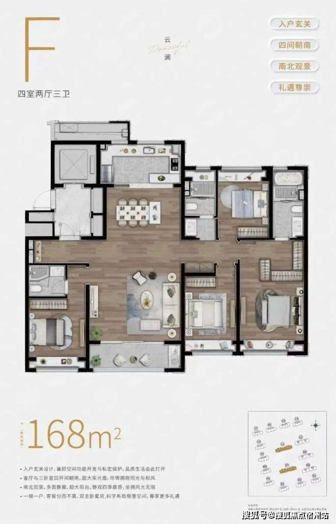 另外,四房户型双房朝北似乎是逃不开的问题,✅✅陆家嘴锦绣云澜售楼处电话:400 - 882 - 4258✅✅但陆家嘴锦绣云澜这个建面约168㎡的4房却做到了三间卧室全朝南,并且南向双套房设计。