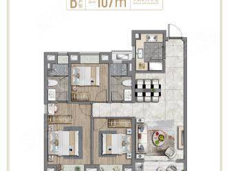 建面约 107-113㎡三房两厅两卫,总价约 349-401 万,空间更宽敞,舒适度全面提升。户型南北通透,全明格局,客厅面宽更大,连通观景阳台,采光视野一流;主卧套房设计,带独立卫浴、衣帽间、飘窗,尊享奢华居住体验;双次卧空间均衡,可满足二孩家庭或三代同堂居住需求;餐厅紧邻厨房,动线合理,方便日常用餐与家庭聚会;多飘窗设计,延伸空间感,增加储物空间,提升居住舒适度。