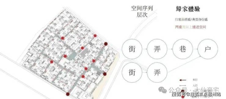 士林润园别墅规划可分为蓬莱路城市公共景观以及社区内部景观两个部分,其中市政绿地衔接于上海2035城市总体规划中“蓝绿丝带”的上位条件要求,社区内部街巷空间形成空间序列形成递进的层次,将归家体验的序列依次展开,形成城市街道→入口(一级门户)→街巷→节点空间→里弄门(二级门户)→合院入户(三级门户)的方式,基本可保证大多数住户可体验到两重以上的空间递进。