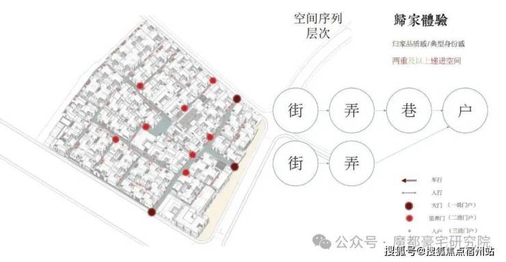 士林润园社区规划可分为蓬莱路城市公共景观以及社区内部景观两个部分,其中市政绿地衔接于上海2035城市总体规划中“蓝绿丝带”的上位条件要求,社区内部街巷空间形成空间序列形成递进的层次,将归家体验的序列依次展开,形成城市街道→入口(一级门户)→街巷→节点空间→里弄门(二级门户)→合院入户(三级门户)的方式,基本可保证大多数住户可体验到两重以上的空间递进。