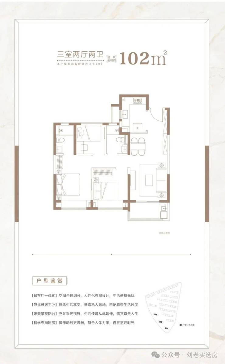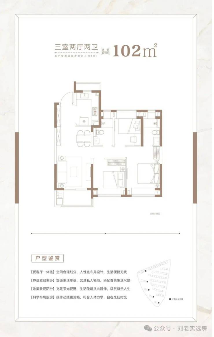 建面约102㎡3房2厅2卫户型,做到了三开间朝南+双朝南卧室带飘窗+动静分离+卫生间干湿分离,采光面拉到极致!是一个非常方正的户型。