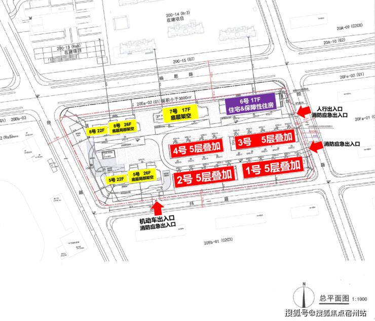 从规划方案来看,「翡雲悦府」二期楼栋的分布总体呈南低北高,东低西高的格局。 东南侧分布4栋叠墅,西侧排布2栋22-26层的大高层,北侧排布2栋17层的高层, 地块内保障房位于东北角。