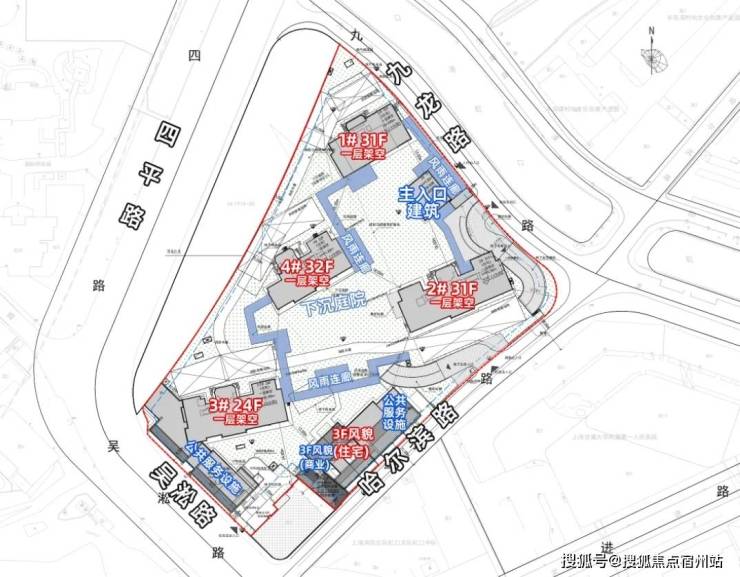 项目拟建4幢24-31层高层住宅以及1幢总高3层的风貌建筑。人行出入口位于九龙路,车行出口和入口分开,出口位于九龙路,入口则在南侧哈尔滨路上。