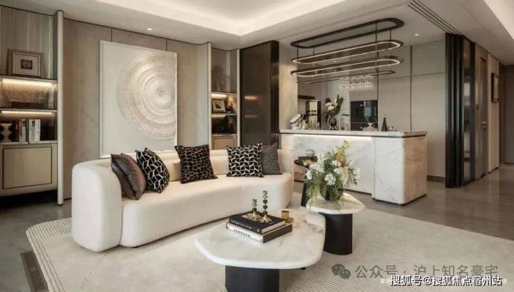 客厅背景墙的“烟雨江南”天然大理石,不同于传统平面背景墙,通过弧度及立体的造型处理,并镶嵌不锈钢材质!对于金茂而言,比奢石昂贵的,是让奢石真正与空间气场融为一体!