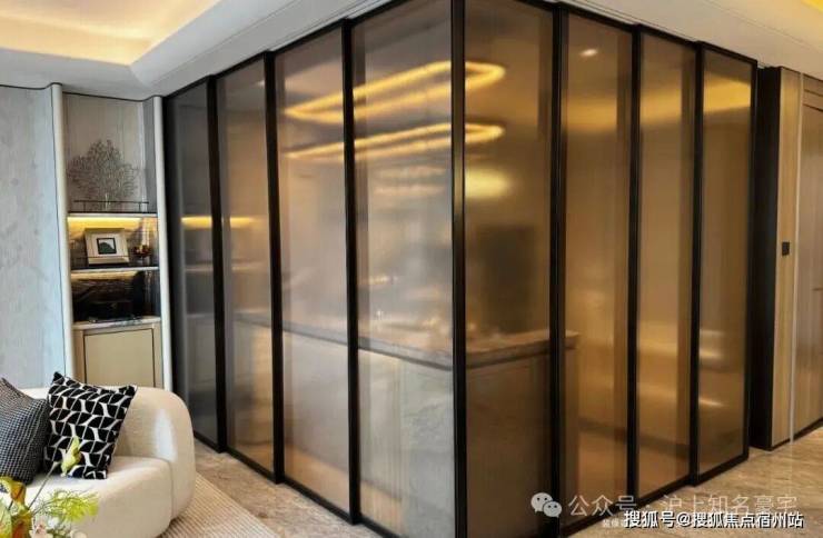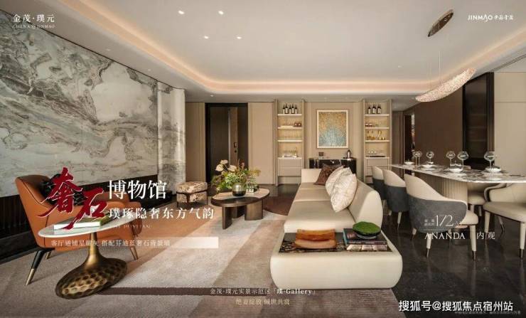客厅背景墙的“烟雨江南”天然大理石,不同于传统平面背景墙,通过弧度及立体的造型处理,并镶嵌不锈钢材质,对于金茂而言,比奢石昂贵的,是让奢石真正与空间气场融为一体。