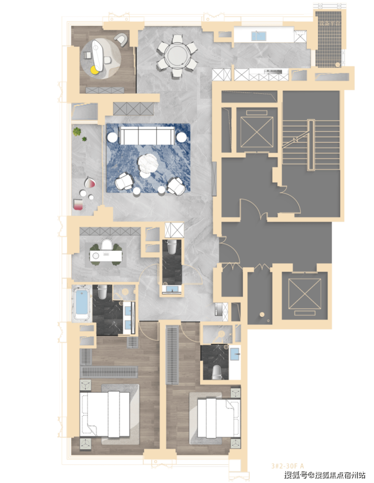其中3#为超高层,北向可观小区绿化和苏河景观,高区可瞰三件套盛景。