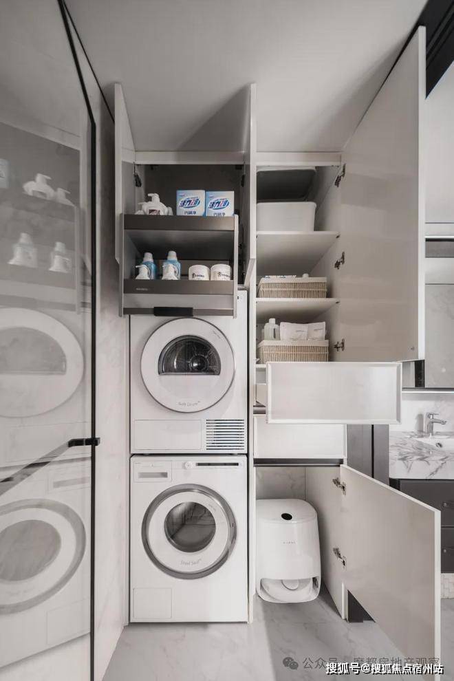 约165以上户型,配备洗烘一体机、洗衣池、储物柜、操作台等;