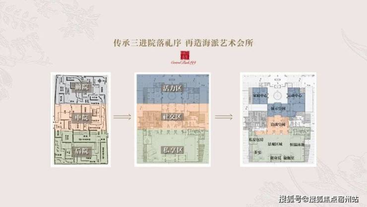 中建·玖上琅宸的会所的格局设计灵感来自于中国古典居住的三进院落,以活力区、社交区、私享区对应前院、中院、后院,真正做到了活动动线分明,移步一景。
