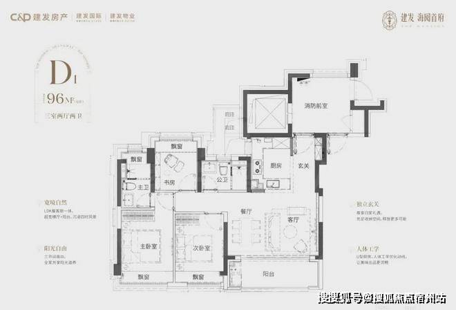这套 建面约103㎡动静分离户型打破常规, 兼具三个房间和南向超阔面宽的横厅,以此承载从二人世界到三代同堂的全生命周期需求。