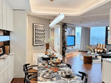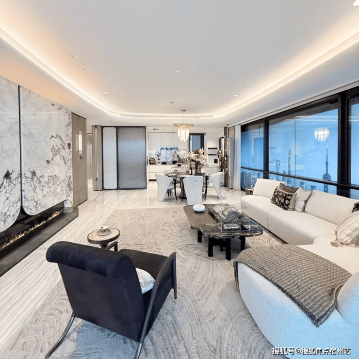 最动人的莫过于此处的视野与尺度:高区户型直面陆家嘴城市天际线,实现了约270°的环幕景观视野。客餐厅与阳台一体化设计,面积近约53㎡,无论是家庭聚会还是商务宴请,都能彰显主人的排场-3。而面积约50㎡的主卧套房,配置了双台盆与独立浴缸,是专属于主人的私密港湾。