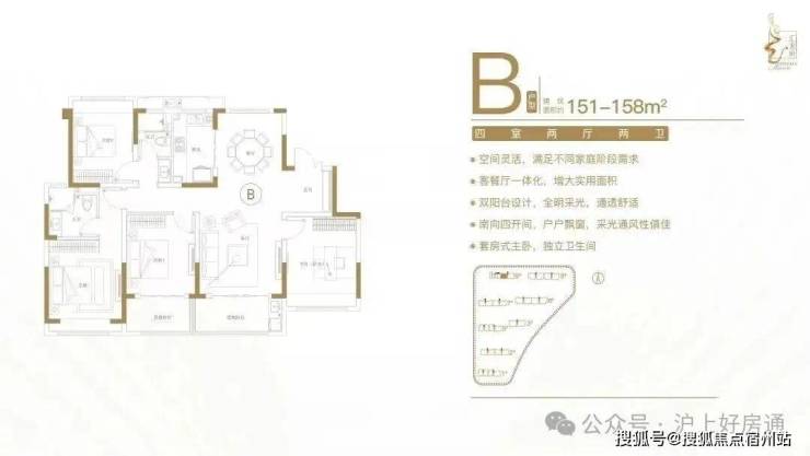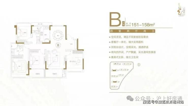 建面约151-158㎡四室两厅两卫户型特点:客餐厅一体化,空间实用,尺度开阔;多功能间设计,满足不同居住需求;全明采光布局,横厅设计,明厨明卫;南向四开间,主生活区域朝南,阳光清风常伴;套房式主卧,主卧带飘窗,独立衣帽卫。