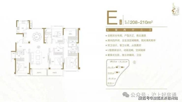 建面约208-210㎡五室两厅三卫户型特点:全明采光布局,户型方正,南北通透;南向四开间,主生活区域朝南,阳光清风常伴;双卫设计,客卫分离,从容美好;U型厨房设计,动线流畅,空间阔绰;套房式主卧,独立衣帽间、卫浴。