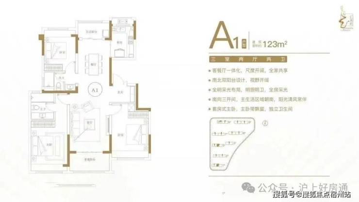 建面约123㎡三室两厅两卫户型特点:客餐厅一体化,尺度开阔,全家共享;南北双阳台设计,视野开阔;全明采光布局,明厨明卫,全房采光;南向三开间,主生活区域朝南,阳光清风常伴;套房式主卧,主卧带飘窗,独立卫生间。