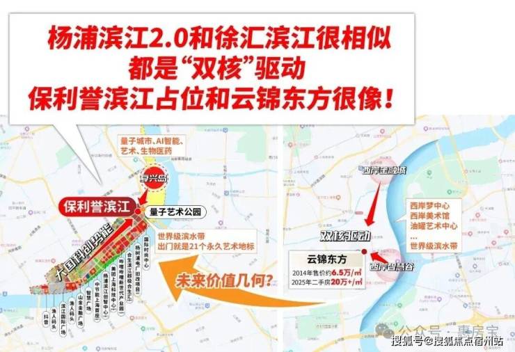 值得一提, 保利誉滨江在杨浦滨江2.0的位置,与云锦东方如出一辙——二者均处于“双核辐射的中心点”。 你要知道云锦东方2014年售价约6.5万/㎡,如今已突破20万+/㎡。