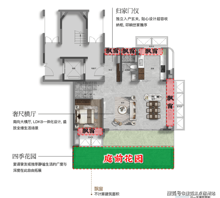 4飘窗+“跑道式阳台”设计,使得一层附赠的面积很大。