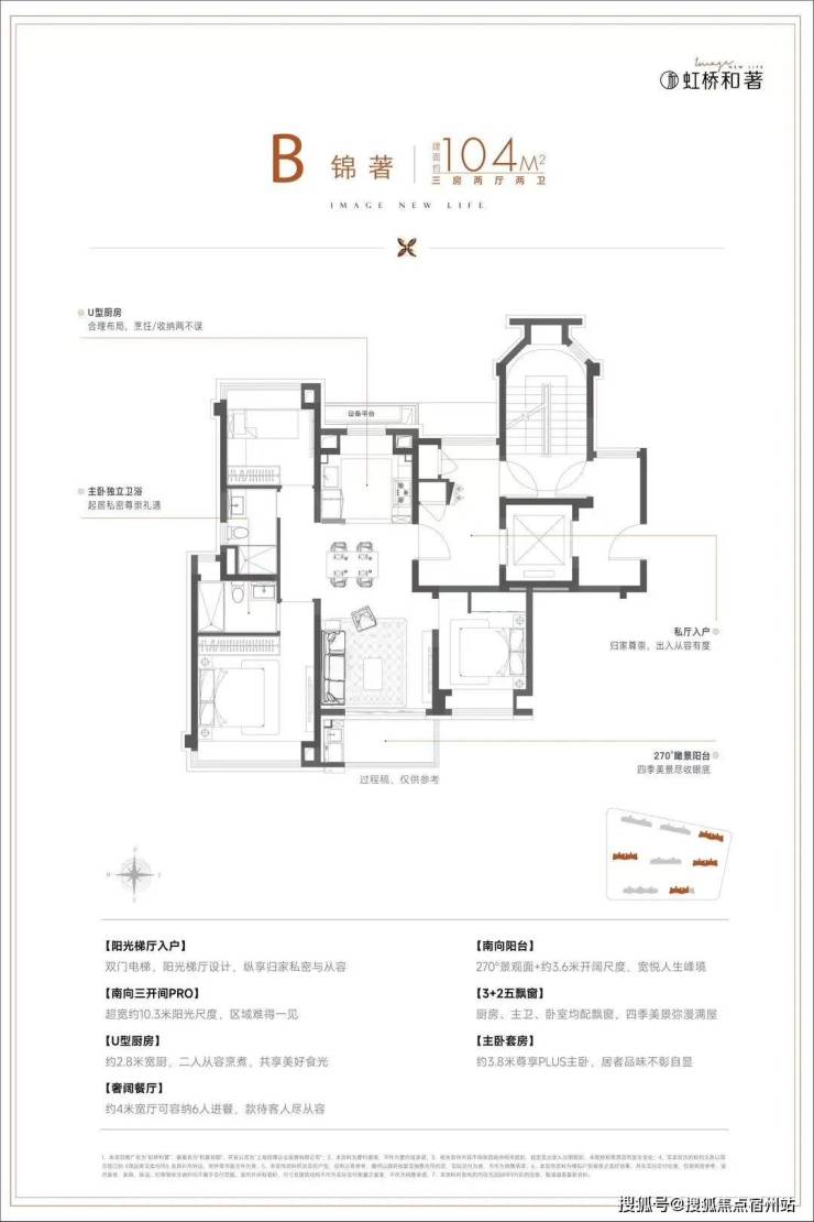 建面约104㎡舒适三房,三开间朝南+动静分区,设计水准颇高。 特别是宽景阳台的设置,为客厅配备一幅iMax广角视野,多角度观赏社区美景,适配对品质有需求的首置或首改客户。