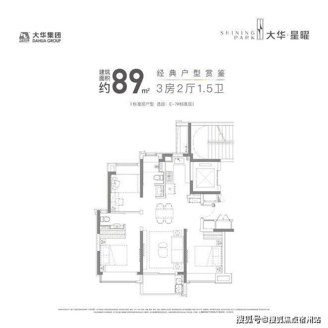建面约89㎡户型,三开间朝南,并且全卧室带飘窗 ,室内的采光、视野以及空间延展性都非常出色。大华星曜售楼处电话:400-8894-638(户型详解专线)