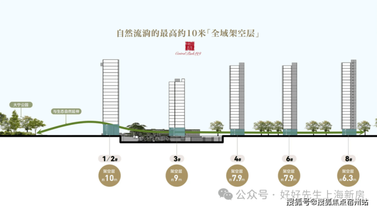 架空层的高度:采用全架空层,最低6.3米,最高10米,将整个社区抬升到豪宅应有的高度。同时,首层不同主题的景观庭院,也获得了更加穿透的视觉效果,地面层也变成了独属于业主的私人定制花园。